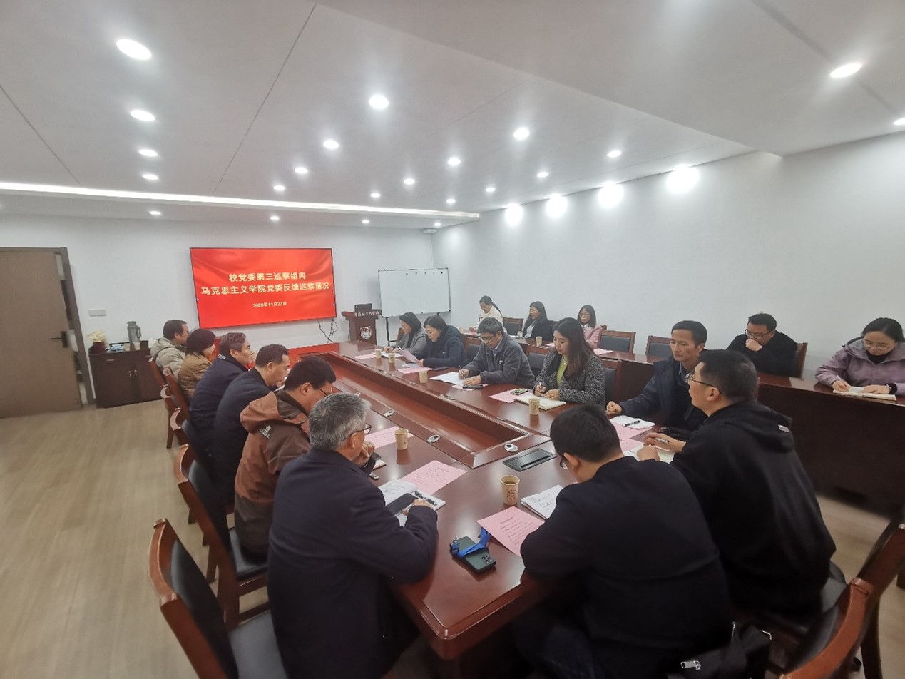 第三巡察组全体成员,马克思主义学院党政领导班子成员,内设机构负责人,党支部书记,党代会、教代会、工代会代表,高职称教师和新教师代表等参加会议。