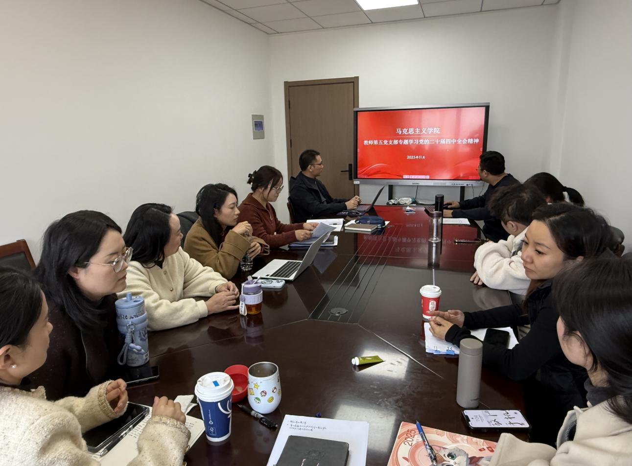近日,教师第五党支部召开全体党员大会,深入学习贯彻党的二十届四中全会精神,谋划贯彻落实的思路举措。党支部书记汪俞辰同志主持会议,支部宣传委员朱嫣丹分享了学校党的二十届四中全会精神报告会的学习体会,部分党员同志进行了交流发言。