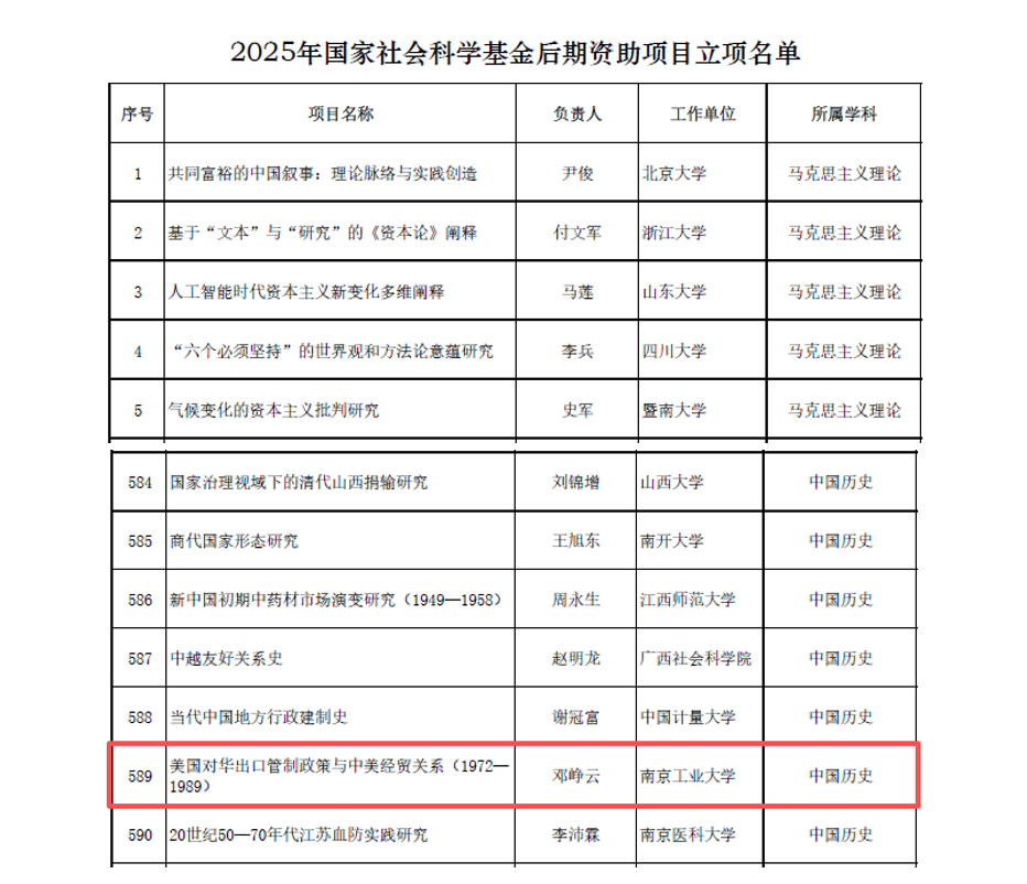 近日,全国哲学社会科学工作办公室发布了2025年国家社会科学基金后期资助项目立项评审结果,我院邓峥云老师申报的课题《美国对华出口管制政策与中美经贸关系(1972—1989)》喜获立项。