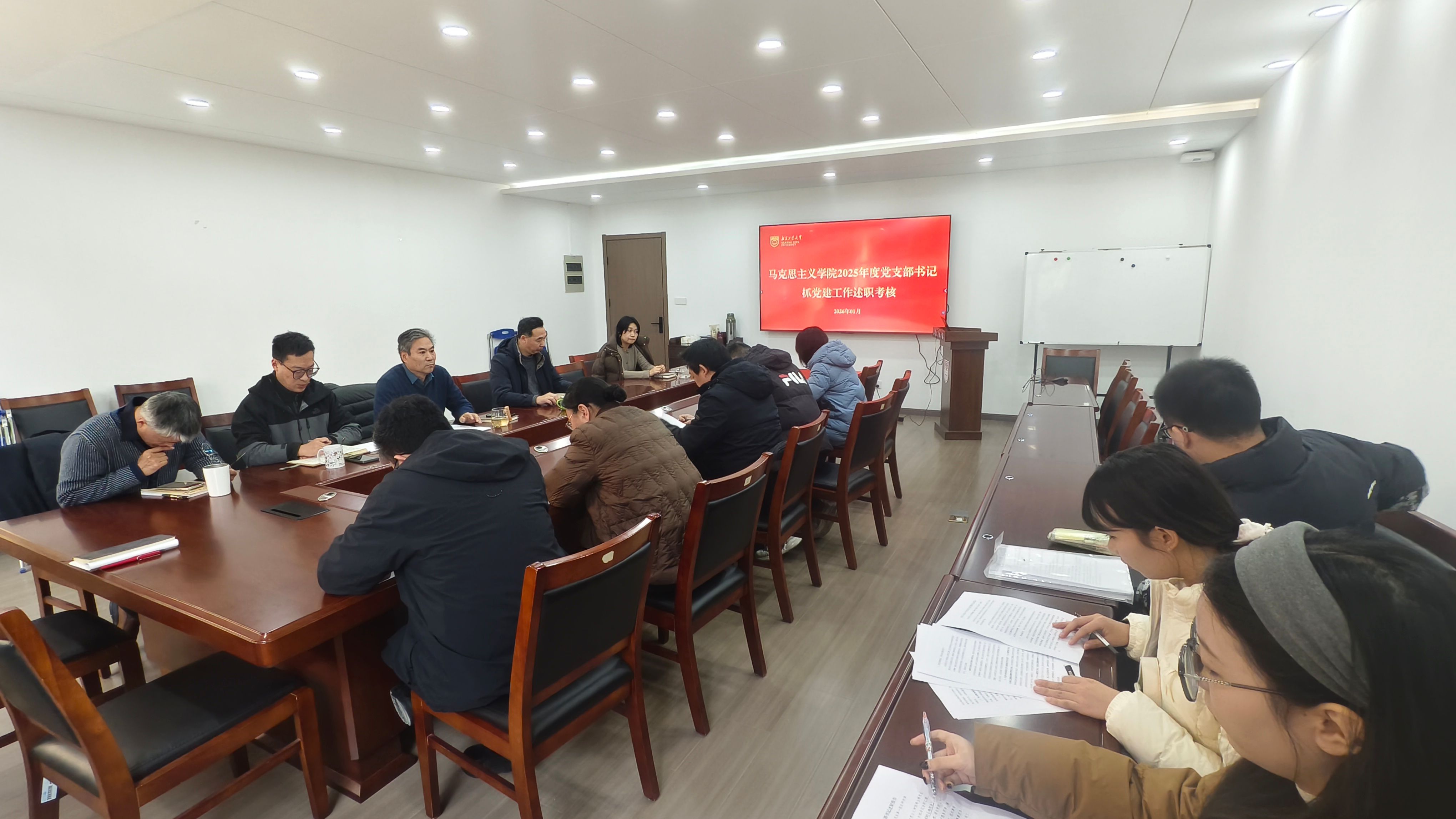 为深入贯彻落实《关于开展2025年度全校党组织书记抓基层党建述职评议考核工作的通知》文件精神,按照学校党委组织部的统一部署,我院于 2026年1月9日上午在笃学楼 302 会议室召开2025年度党支部书记抓党建述职评议考核会议。此次会议由学院党委书记张振海主持,党委副书记、院长眭国荣,副院长陶然,副院长滕飞和院长助理刘海存出席,学院全体党支部书记参加了会议。